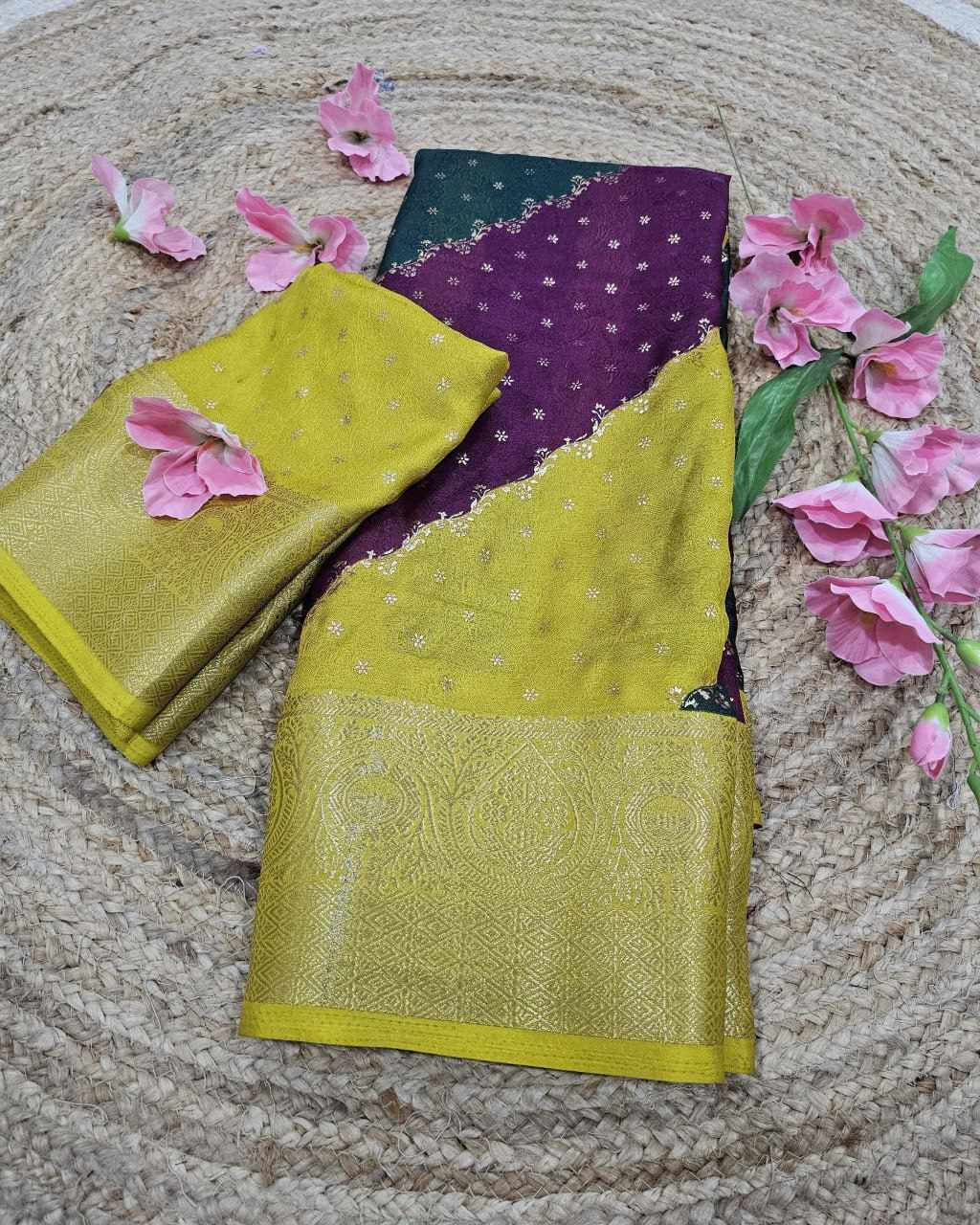 Saree Fabric :march mellow jecard border with foil printed sarees design