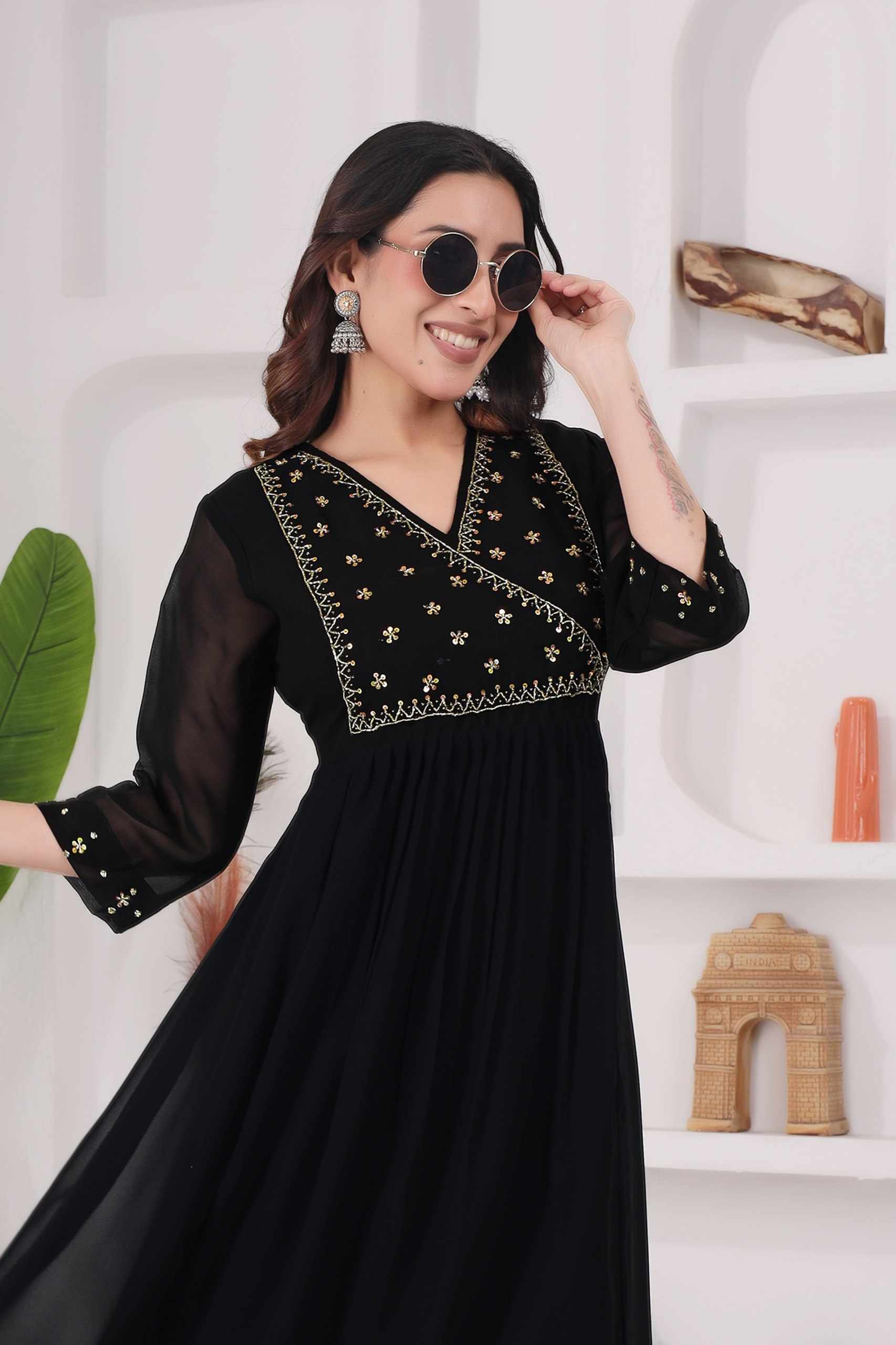 WM12 BLACK BLOOMING GEORGETTE BEAUTIFUL HANDWORK KURTI