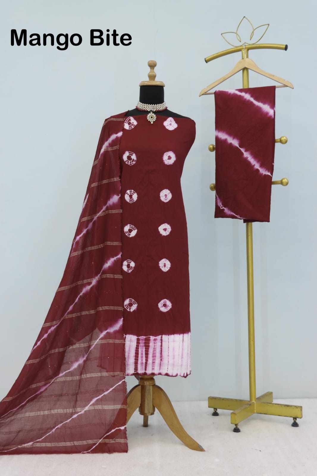 | Name : | KT FIZA Pure Rayon Bandhni Dress Materail |
